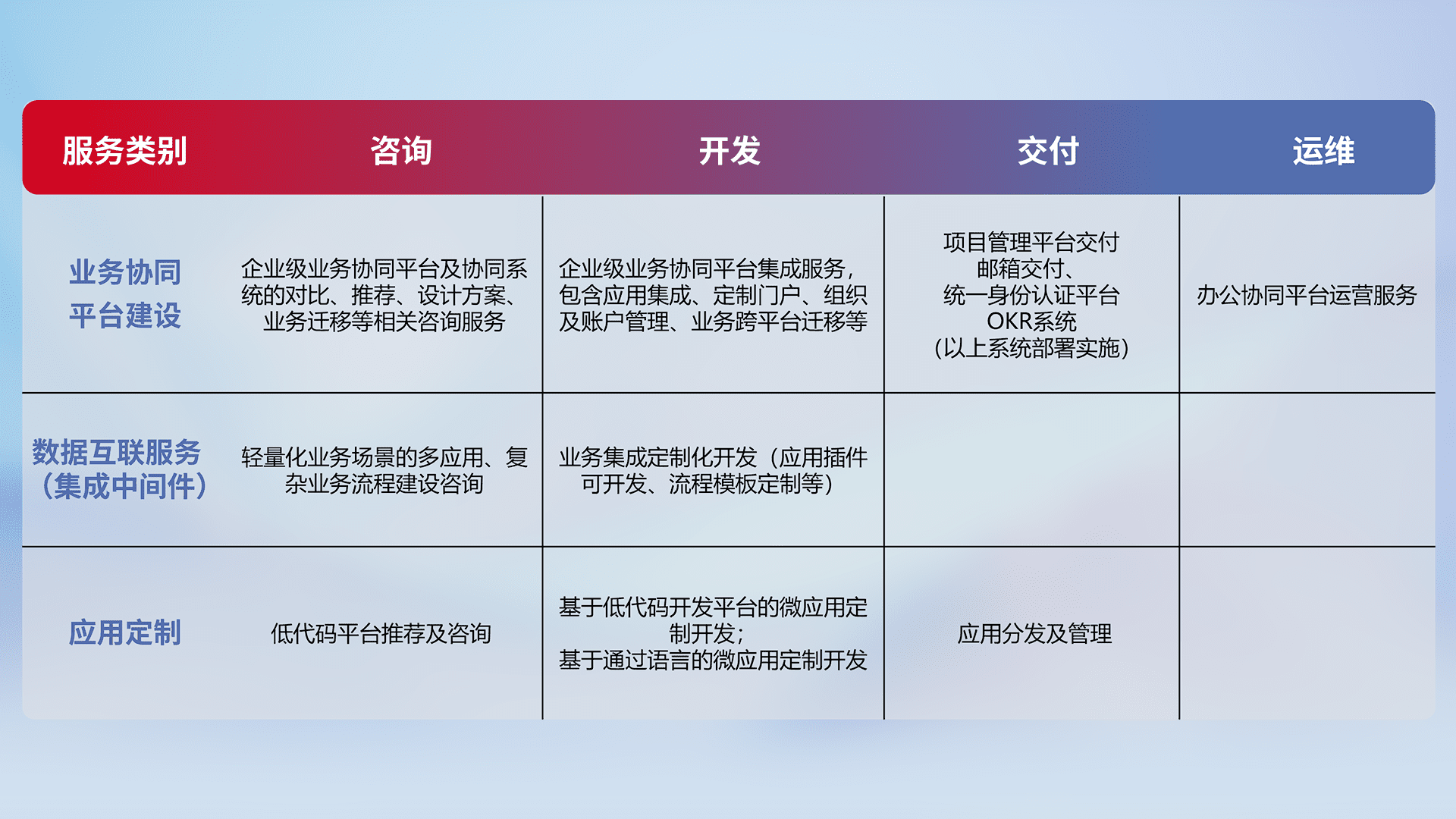 针对钉钉、、、、企微、、、、IDaas等平台级产品提供产品的规划、、、方案、、、、交付、、定制化开发等服务,,,实现如统一协同办公、、、智能客户服务、、混合会议管理、、智能数据查询、、等业务场景,,,实现数字化转型。。。。